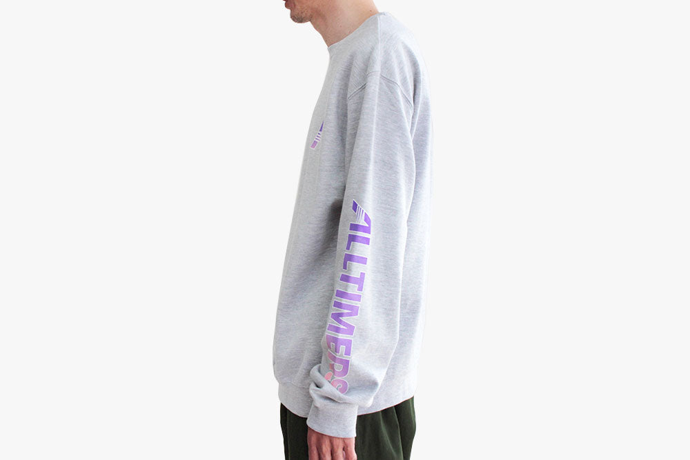 NYC ローカルブランド、Alltimers。着心地の軽いクルーネックスウェット。写真は174cmの男性がMサイズを着用しています。