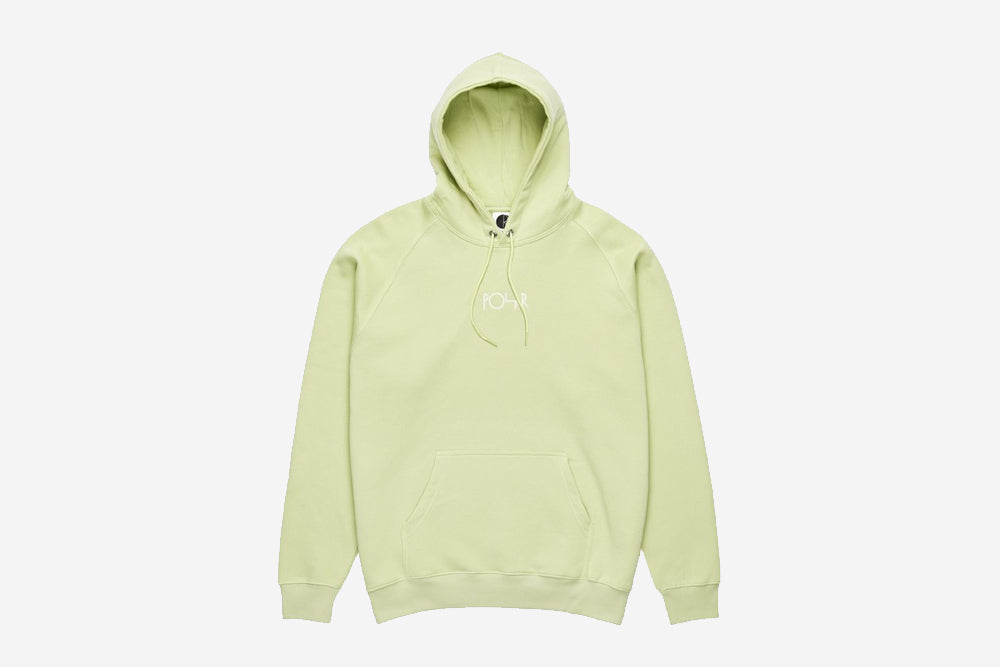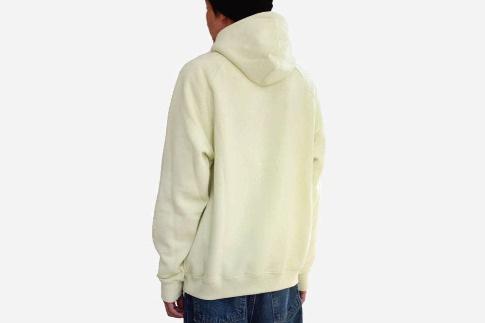 90%コットン、10%ポリエステル素材を採用した、裏起毛仕様のフーデッドプルオーバー。胸に刺繍ロゴが入っています。写真は174cmの男性がMサイズを着用しています。