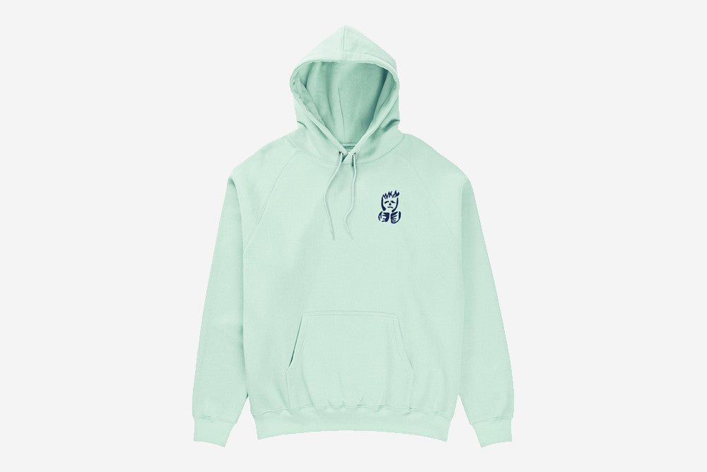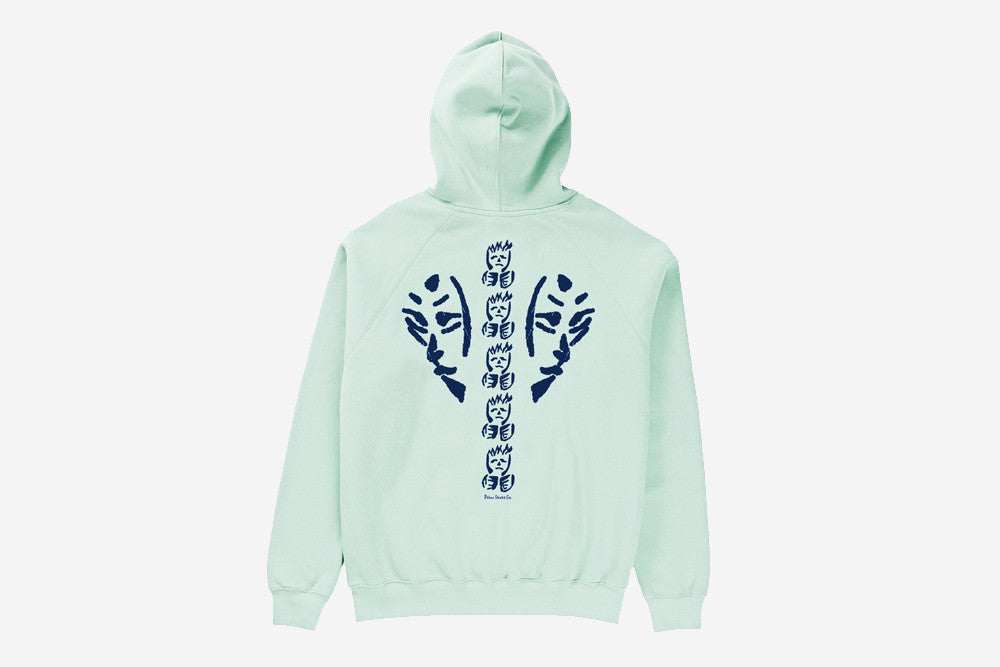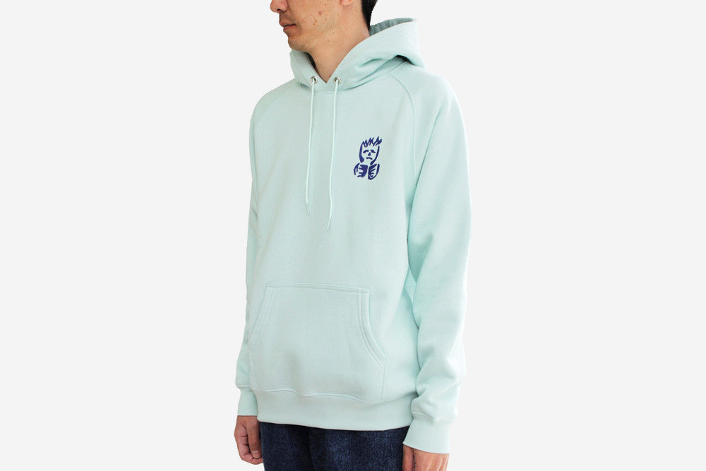 90%コットン、10%ポリエステル素材を採用した、裏起毛仕様のフーデッドプルオーバー。Artwork by Kevin Rodrigues。写真は174cmの男性がMサイズを着用しています。