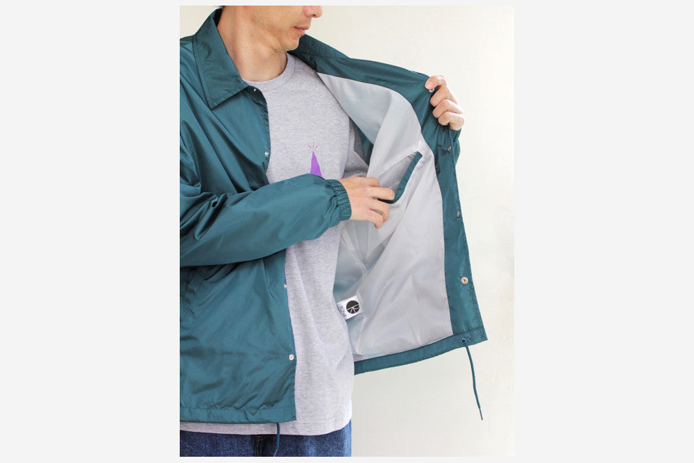 オーソドックスなデザインのコーチジャケット。表地は100%ナイロン、裏地は100%ポリエステルを採用。Artwork by Kevin Rodrigues。写真は174cmの男性がMサイズを着用しています。