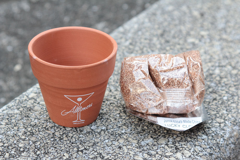 ロゴがプリントされたデスクトップサイズのクレイポットと種(Lucky Clover)と土のセット。