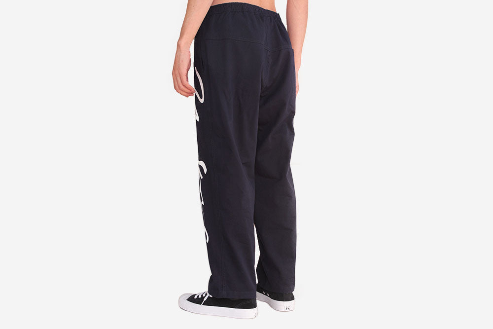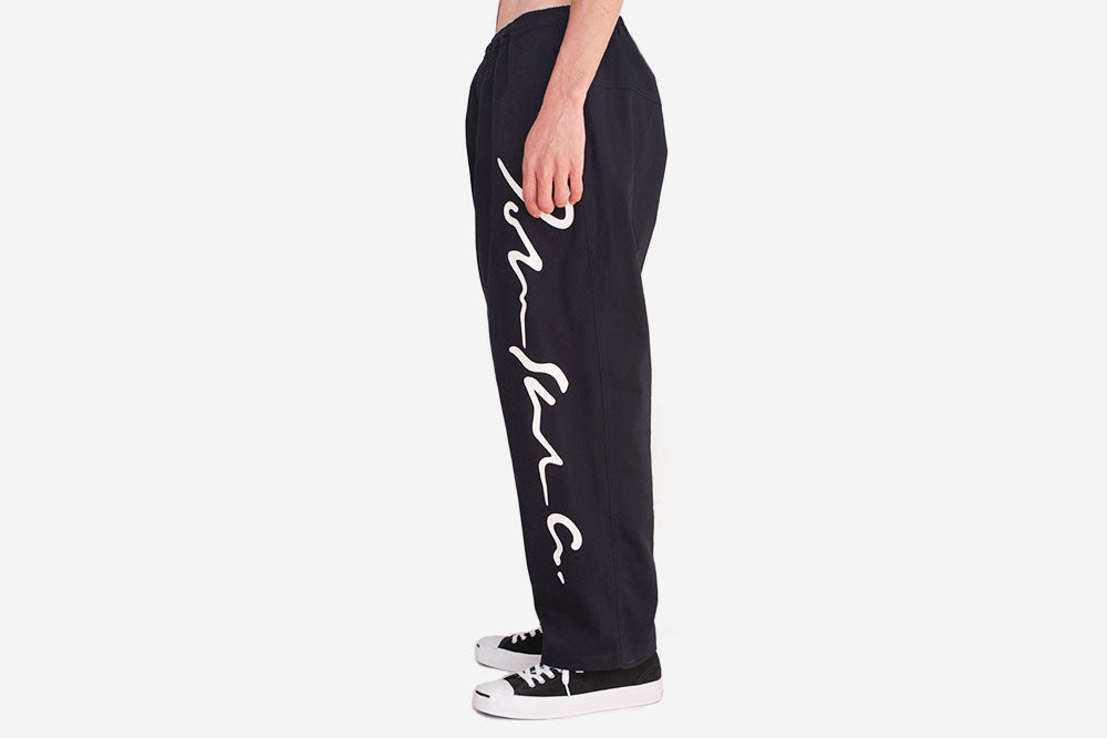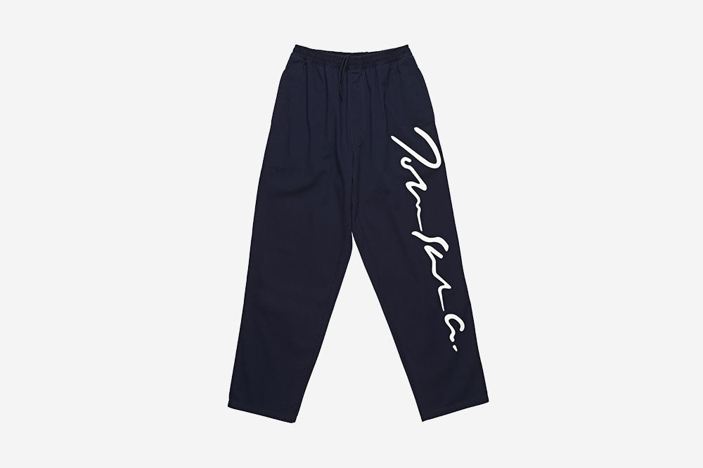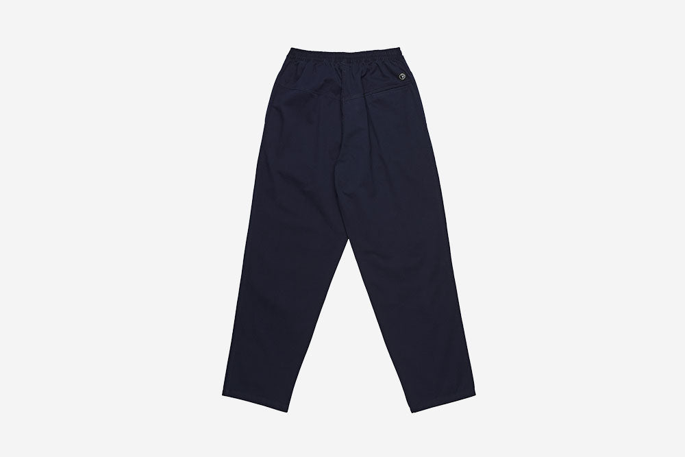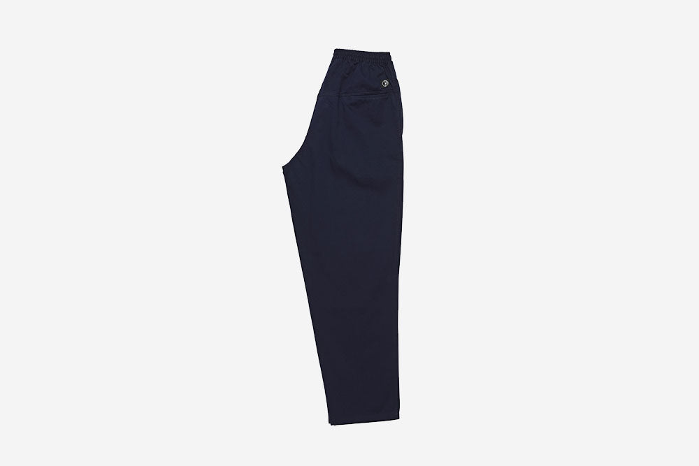 ルーズなテーパードシルエットを採用したイージーパンツ。薄手のコットンチノ素材。ウェストは紐を内蔵した伸縮ゴムタイプ。写真は174cmの男性がSサイズを着用しています。