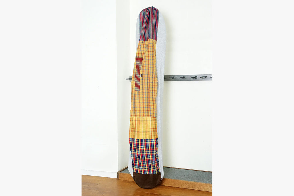 クロージングブランド、KAYA にこういうボードケースが欲しいとイメージを伝え形にしてもらった styrus 別注スノーボードケース。トップパネルに着物に使われるヴィンテージの布を、サイドとソール側には耐衝撃性・吸水性のあるスウェット素材を採用。マチがついているので、バイディングを付けた状態でラクに収納できます。すべて完全ハンドメイドの一点モノ。写真はバインディングの付いた163cmのボードを入れた状態で撮影しています。